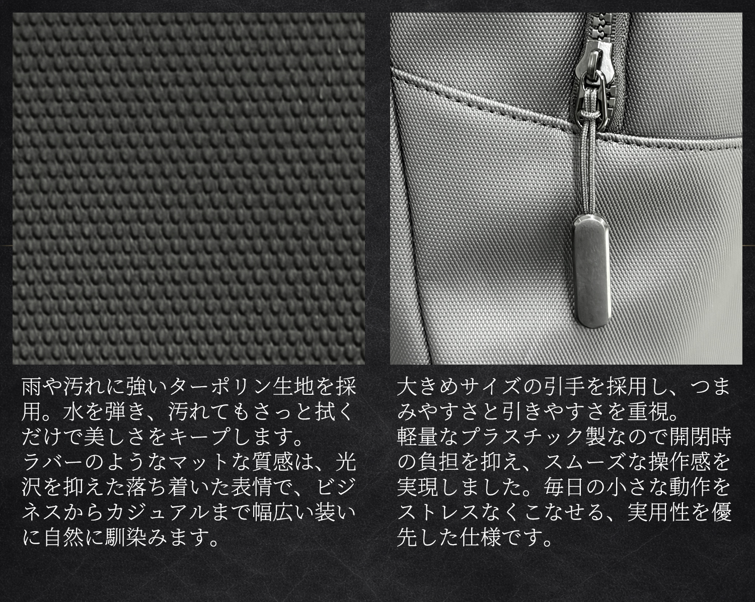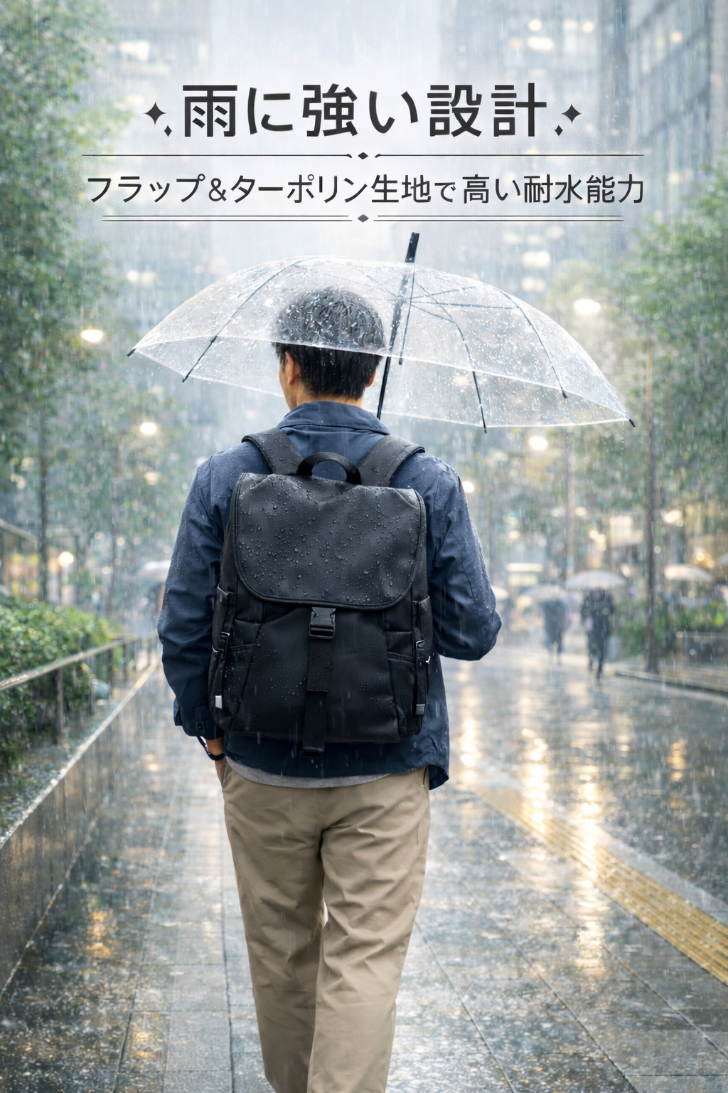 ターポリン生地採用で耐水性と耐久性に優れ、街中の通勤からアウトドアまで天候を気にせずタフに使えるバックパックです。