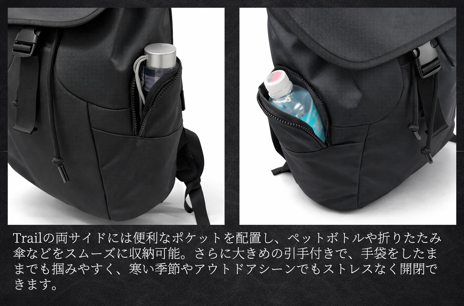 Trailは、日常からアクティブシーンまでシームレスに活躍する高機能バックパックです。